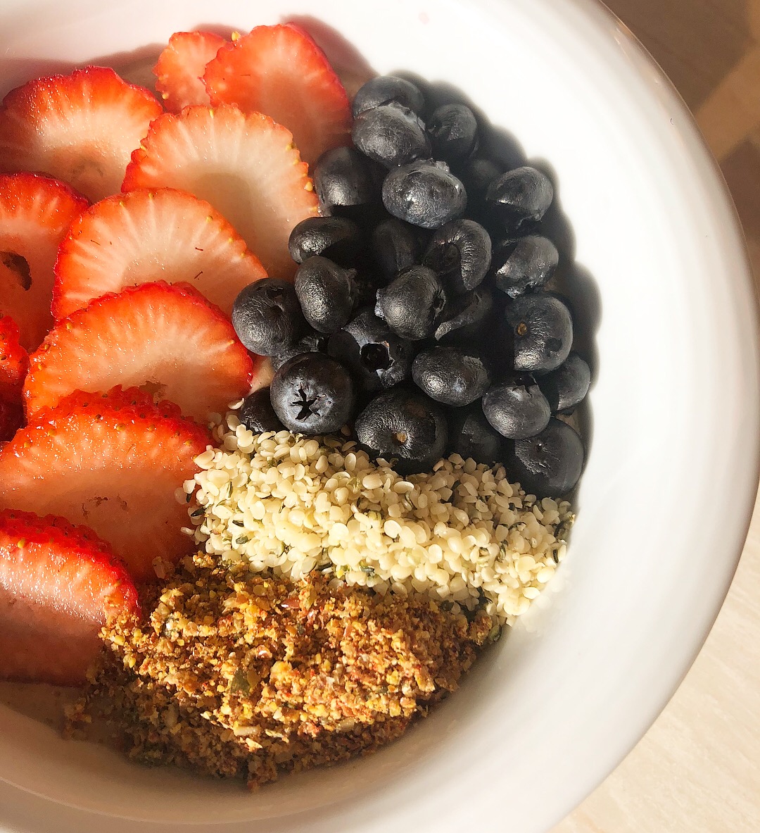 - Sirve la mezcla en un bowl y como toppings agrega las fresas, los arándanos, las semillas de hemp y el superfood mix.